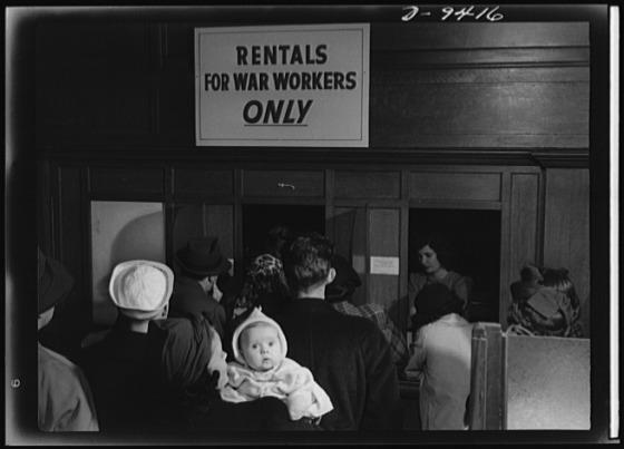 War housing needs. Crowds of homeseekers wait in line for housing information in every "boom town" war housing center. Like millions of Americans who have migrated to busy industrial areas, these newcomers to San Francisco are hoping for news that a house, a room, or even a bed will be made available for them before the day is over