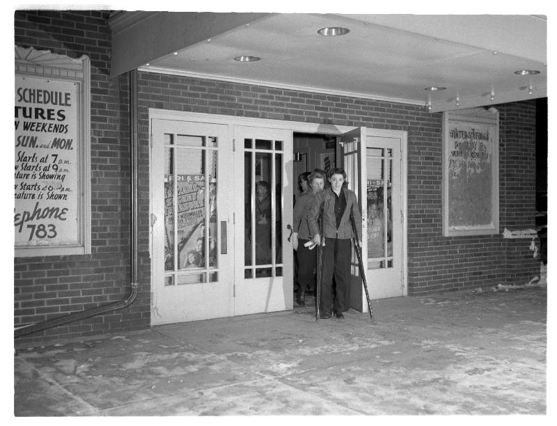 Bantam, Connecticut. Demetress Welch, veteran of the Warren McArthur upholstery shop suffered a pair of broken ankles in a bad automobile crash in November 1941. Here she is coming out of the Bantam theater, which is open four nights weekly during the winter--seven nights summers, when vacationers from the Bantam Lake cottages swell the audience