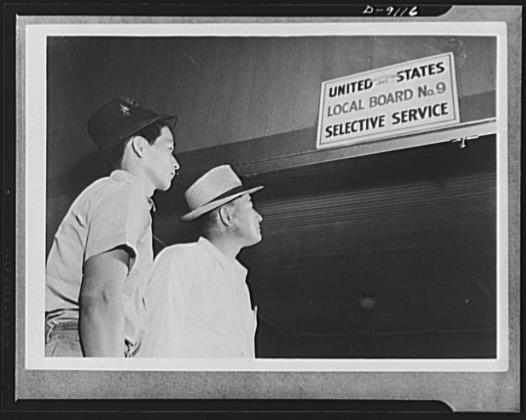 Japanese enlistment. These Americans of Japanese ancestry are about to enter their draft board at Waipahu, Territory of Hawaii, to apply for voluntary induction into the U.S. Army. They intend to fight for Uncle Sam as member of a combat regiment made up of 1,500 American citizens of Japanese ancestry. Yoshito Matsusaka (right), thirty-six, is a former lieutenant in the U.S. Army Reserve