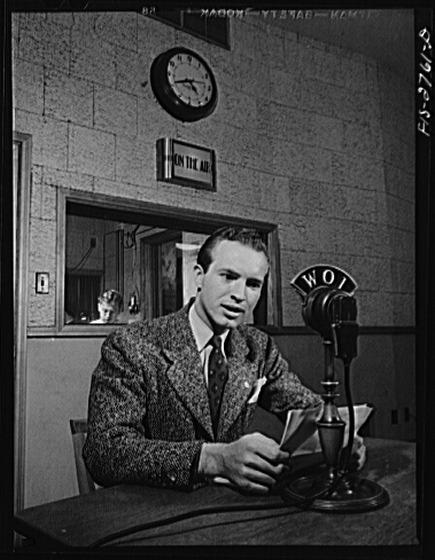 Don Jackson, a senior, delivering a news broadcast at the Iowa State College radio station. Jackson comes from a farm in Iowa. Recently won honorable mention in a nationwide contest sponsored by Dodd, Meade and Company for a book he wrote and which they published. He lost a brother in the Pearl Harbor attack. Jackson has worked his way through college. Iowa State College, Ames, Iowa