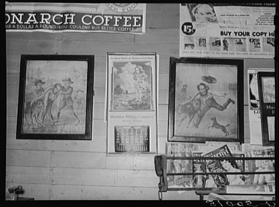 Decorations in store at Alger. Sheridan County, Montana. The early American prints are very good examples