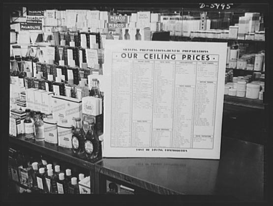 Price control. Anti-inflation window display. Well designed because it is easily read, this poster illustrates the correct method for displaying ceiling price items on the Office of Price Administration's (OPA) cost-of-living commodity list, established for all goods essential to the daily requirements of the average family. These lists must clearly identify each item, stating size or quantity and ceiling price