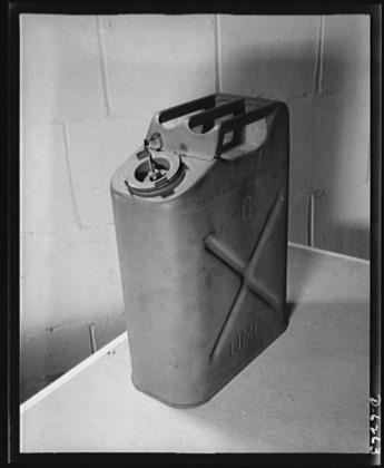 Substitute materials containers. New army "blitz" can. A five-gallon metal container for water, oil, or gasoline, constructed with air spaces to prevent sinking