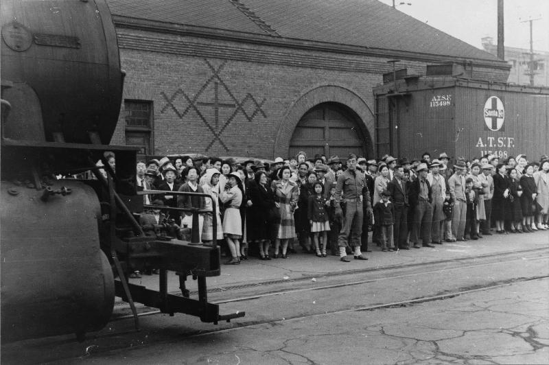 Los Angeles, California. The evacuation of Japanese-Americans from West Coast areas under U.S. Army war emergency order. Waiting for train to take them to Owens Valley