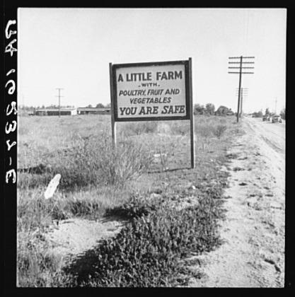 Real estate sign along the highway on which hundreds of drought refugees and migrant workers travel. Riverside County, California