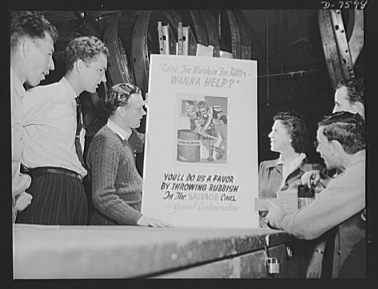 Production. Airplane manufacture, general. A group of North American employees at Inglewood, California, look over a new poster on material conservation. The department which produced the poster is saving tons of vital material. This plant produces the battle-tested B-25 ("Billy Mitchell") bomber, used in General Doolittle's raid on Tokyo, and the P-51 ("Mustang") fighter plane, which was first brought into prominence by the British raid on Dieppe