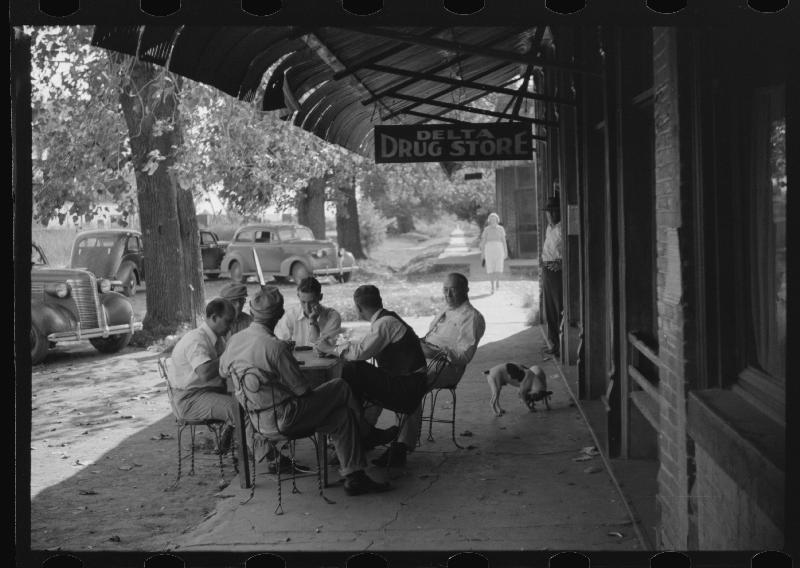 Playing dominoes or cards in front of drug store in center of town, in Mississippi Delta, Mississippi